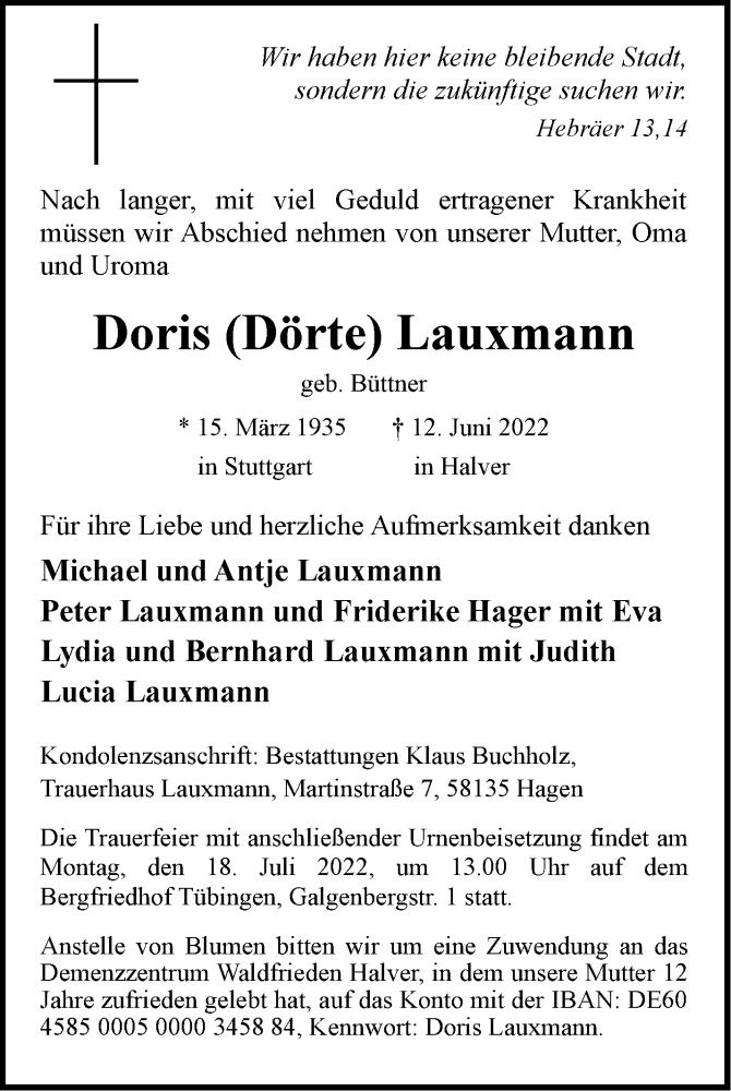 Hier finden Sie alle Traueranzeigen aus der Zeitung, die bisher für Doris Lauxmann erschienen sind. Weitere Traueranzeigen, die in der Zeitung erscheinen, werden hier ebenfalls aufgelistet