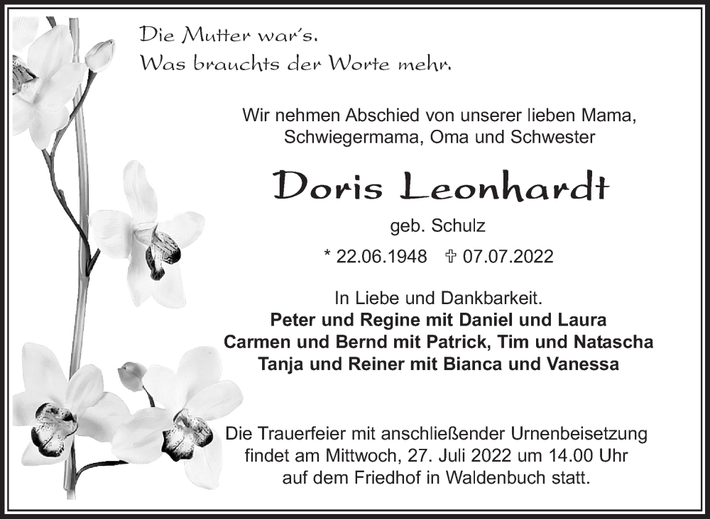 Hier finden Sie alle Traueranzeigen aus der Zeitung, die bisher für Doris Leonhardt erschienen sind. Weitere Traueranzeigen, die in der Zeitung erscheinen, werden hier ebenfalls aufgelistet