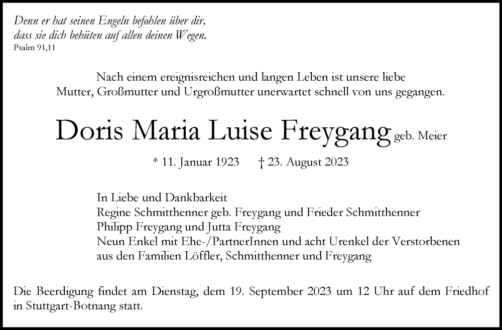 Hier finden Sie alle Traueranzeigen aus der Zeitung, die bisher für Doris Maria Luise Freygang erschienen sind. Weitere Traueranzeigen, die in der Zeitung erscheinen, werden hier ebenfalls aufgelistet