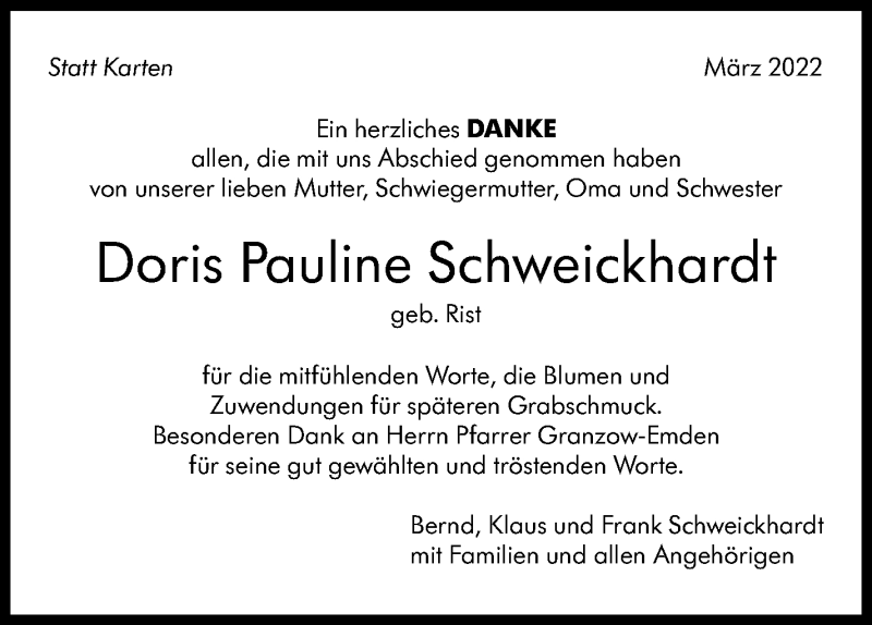 Hier finden Sie alle Traueranzeigen aus der Zeitung, die bisher für Doris Pauline Schweickhardt erschienen sind. Weitere Traueranzeigen, die in der Zeitung erscheinen, werden hier ebenfalls aufgelistet