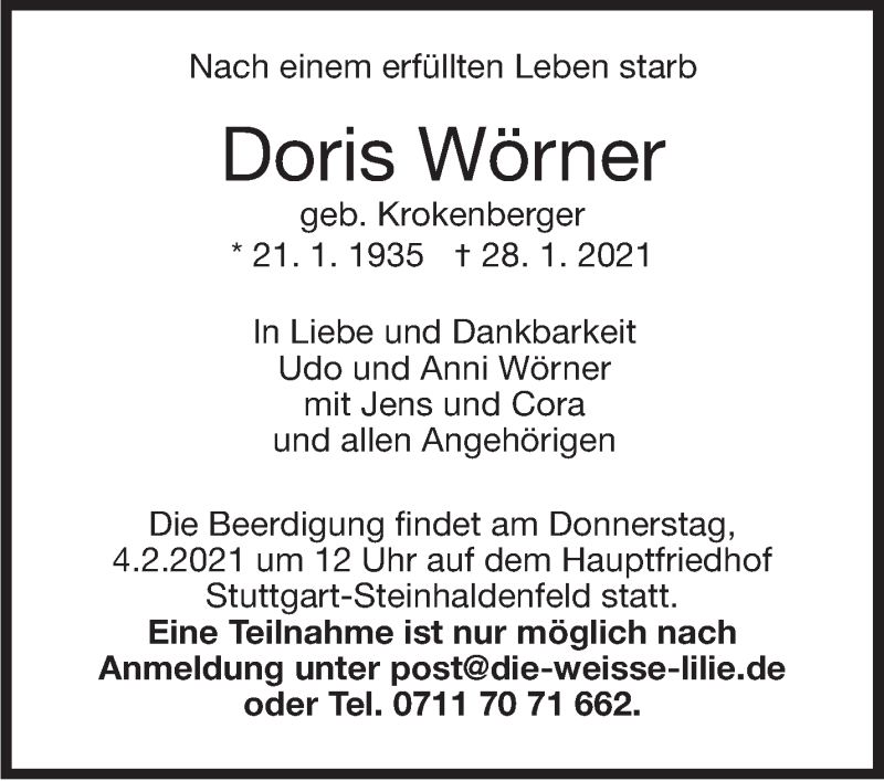 Hier finden Sie alle Traueranzeigen aus der Zeitung, die bisher für Doris Wörner erschienen sind. Weitere Traueranzeigen, die in der Zeitung erscheinen, werden hier ebenfalls aufgelistet