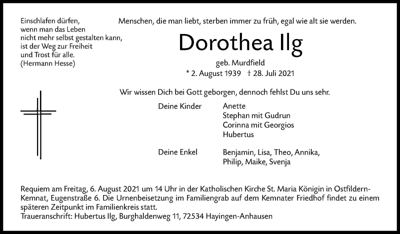 Hier finden Sie alle Traueranzeigen aus der Zeitung, die bisher für Dorothea Ilg erschienen sind. Weitere Traueranzeigen, die in der Zeitung erscheinen, werden hier ebenfalls aufgelistet