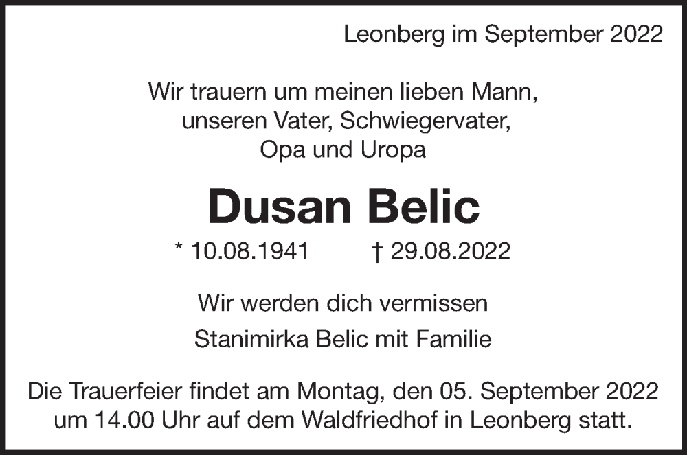 Hier finden Sie alle Traueranzeigen aus der Zeitung, die bisher für Dusan Belic erschienen sind. Weitere Traueranzeigen, die in der Zeitung erscheinen, werden hier ebenfalls aufgelistet