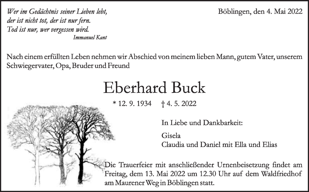Hier finden Sie alle Traueranzeigen aus der Zeitung, die bisher für Eberhard Buck erschienen sind. Weitere Traueranzeigen, die in der Zeitung erscheinen, werden hier ebenfalls aufgelistet