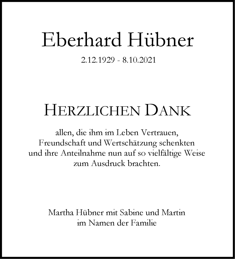 Hier finden Sie alle Traueranzeigen aus der Zeitung, die bisher für Eberhard Hübner erschienen sind. Weitere Traueranzeigen, die in der Zeitung erscheinen, werden hier ebenfalls aufgelistet