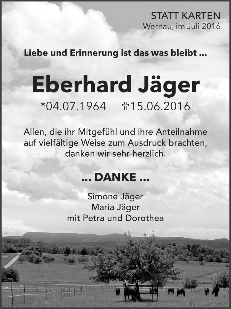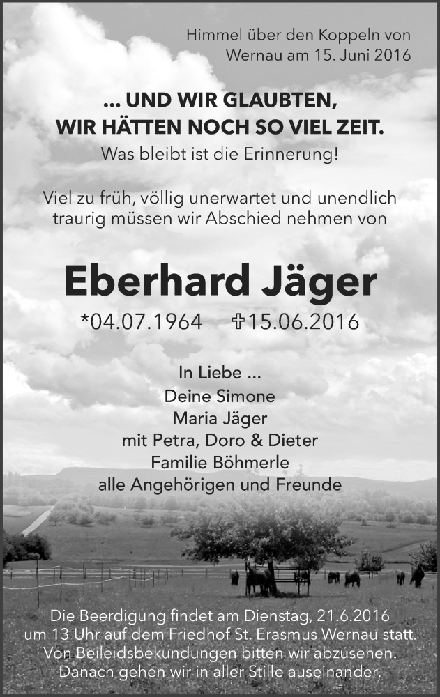 Hier finden Sie alle Traueranzeigen aus der Zeitung, die bisher für Eberhard Jäger erschienen sind. Weitere Traueranzeigen, die in der Zeitung erscheinen, werden hier ebenfalls aufgelistet