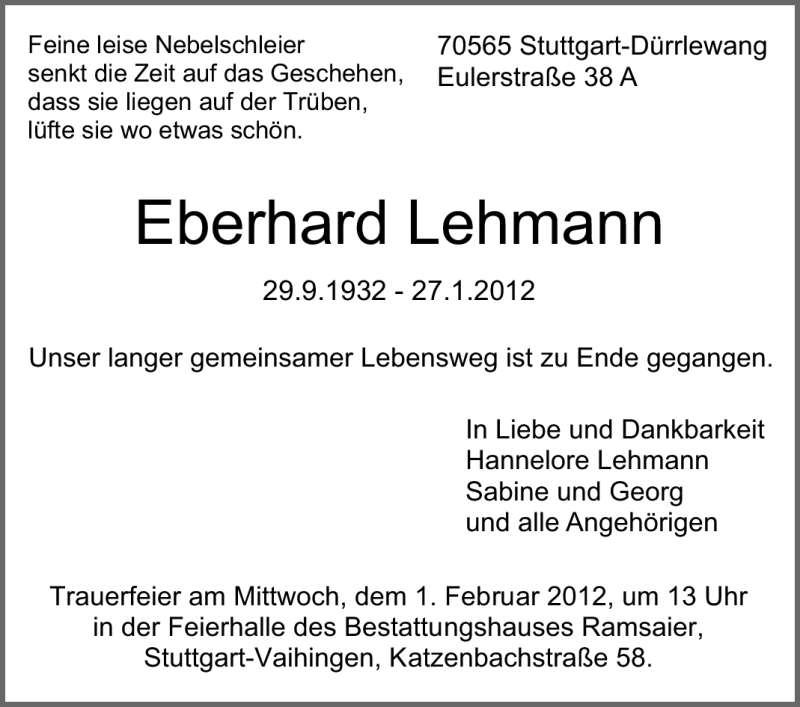 Hier finden Sie alle Traueranzeigen aus der Zeitung, die bisher für Eberhard Lehmann erschienen sind. Weitere Traueranzeigen, die in der Zeitung erscheinen, werden hier ebenfalls aufgelistet