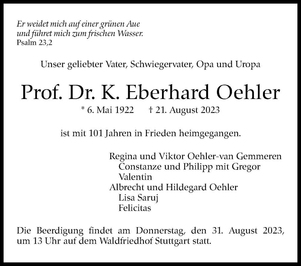 Hier finden Sie alle Traueranzeigen aus der Zeitung, die bisher für Eberhard Oehler erschienen sind. Weitere Traueranzeigen, die in der Zeitung erscheinen, werden hier ebenfalls aufgelistet