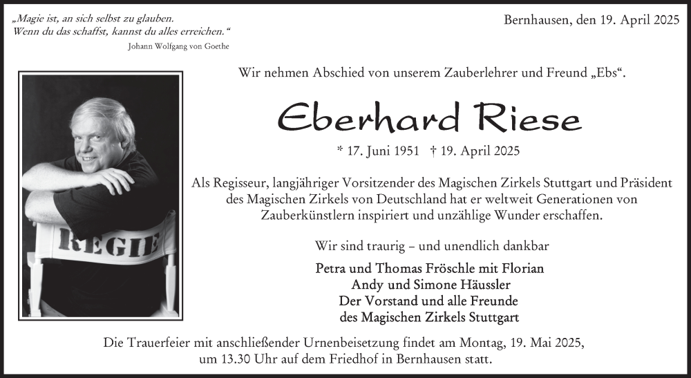 Hier finden Sie alle Traueranzeigen aus der Zeitung, die bisher für Eberhard Riese erschienen sind. Weitere Traueranzeigen, die in der Zeitung erscheinen, werden hier ebenfalls aufgelistet