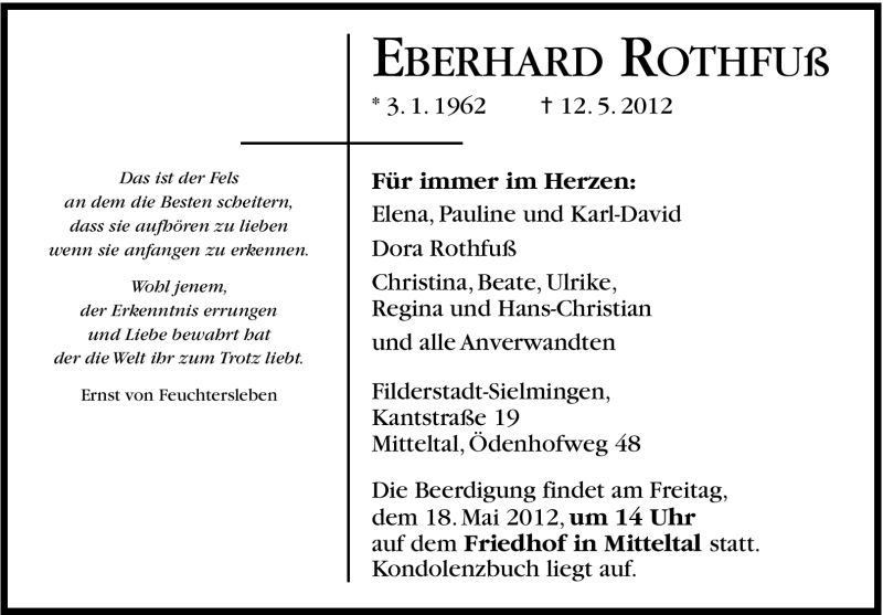 Hier finden Sie alle Traueranzeigen aus der Zeitung, die bisher für Eberhard Rothfuß erschienen sind. Weitere Traueranzeigen, die in der Zeitung erscheinen, werden hier ebenfalls aufgelistet