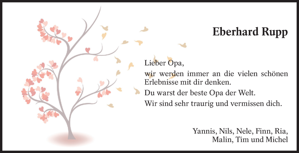 Hier finden Sie alle Traueranzeigen aus der Zeitung, die bisher für Eberhard Rupp erschienen sind. Weitere Traueranzeigen, die in der Zeitung erscheinen, werden hier ebenfalls aufgelistet