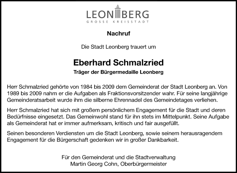 Hier finden Sie alle Traueranzeigen aus der Zeitung, die bisher für Eberhard Schmalzried erschienen sind. Weitere Traueranzeigen, die in der Zeitung erscheinen, werden hier ebenfalls aufgelistet