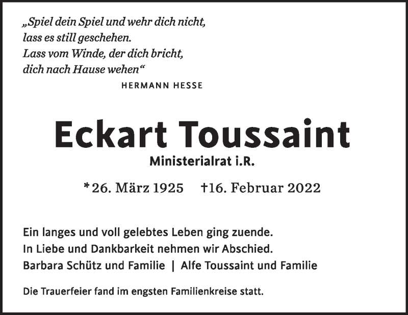 Hier finden Sie alle Traueranzeigen aus der Zeitung, die bisher für Eckart Toussaint erschienen sind. Weitere Traueranzeigen, die in der Zeitung erscheinen, werden hier ebenfalls aufgelistet