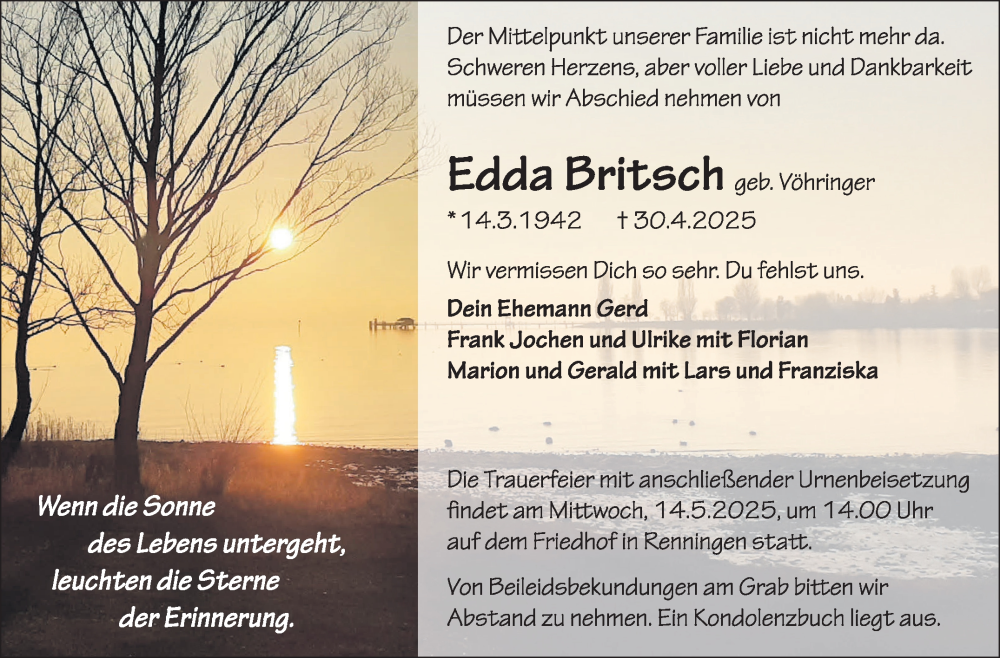 Hier finden Sie alle Traueranzeigen aus der Zeitung, die bisher für Edda Britsch erschienen sind. Weitere Traueranzeigen, die in der Zeitung erscheinen, werden hier ebenfalls aufgelistet