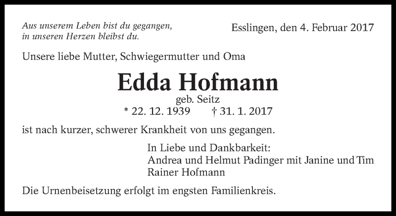 Hier finden Sie alle Traueranzeigen aus der Zeitung, die bisher für Edda Hofmann erschienen sind. Weitere Traueranzeigen, die in der Zeitung erscheinen, werden hier ebenfalls aufgelistet