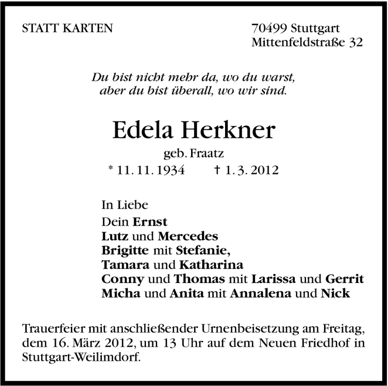 Hier finden Sie alle Traueranzeigen aus der Zeitung, die bisher für Edela Herkner erschienen sind. Weitere Traueranzeigen, die in der Zeitung erscheinen, werden hier ebenfalls aufgelistet