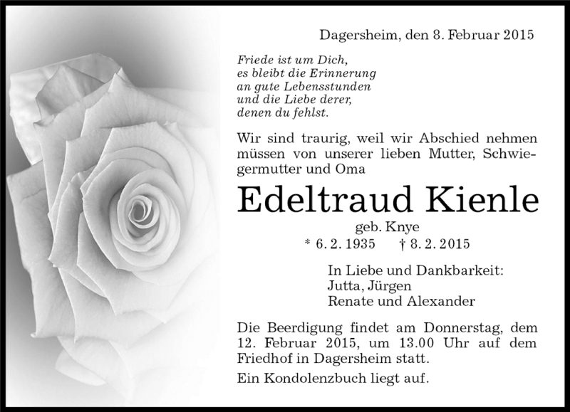Hier finden Sie alle Traueranzeigen aus der Zeitung, die bisher für Edeltraud Kienle erschienen sind. Weitere Traueranzeigen, die in der Zeitung erscheinen, werden hier ebenfalls aufgelistet