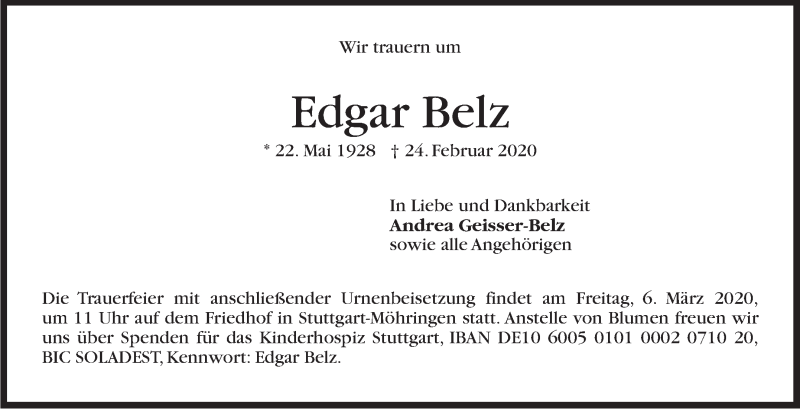 Hier finden Sie alle Traueranzeigen aus der Zeitung, die bisher für Edgar Belz erschienen sind. Weitere Traueranzeigen, die in der Zeitung erscheinen, werden hier ebenfalls aufgelistet