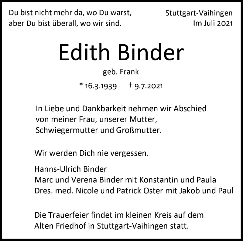 Hier finden Sie alle Traueranzeigen aus der Zeitung, die bisher für Edith Binder erschienen sind. Weitere Traueranzeigen, die in der Zeitung erscheinen, werden hier ebenfalls aufgelistet