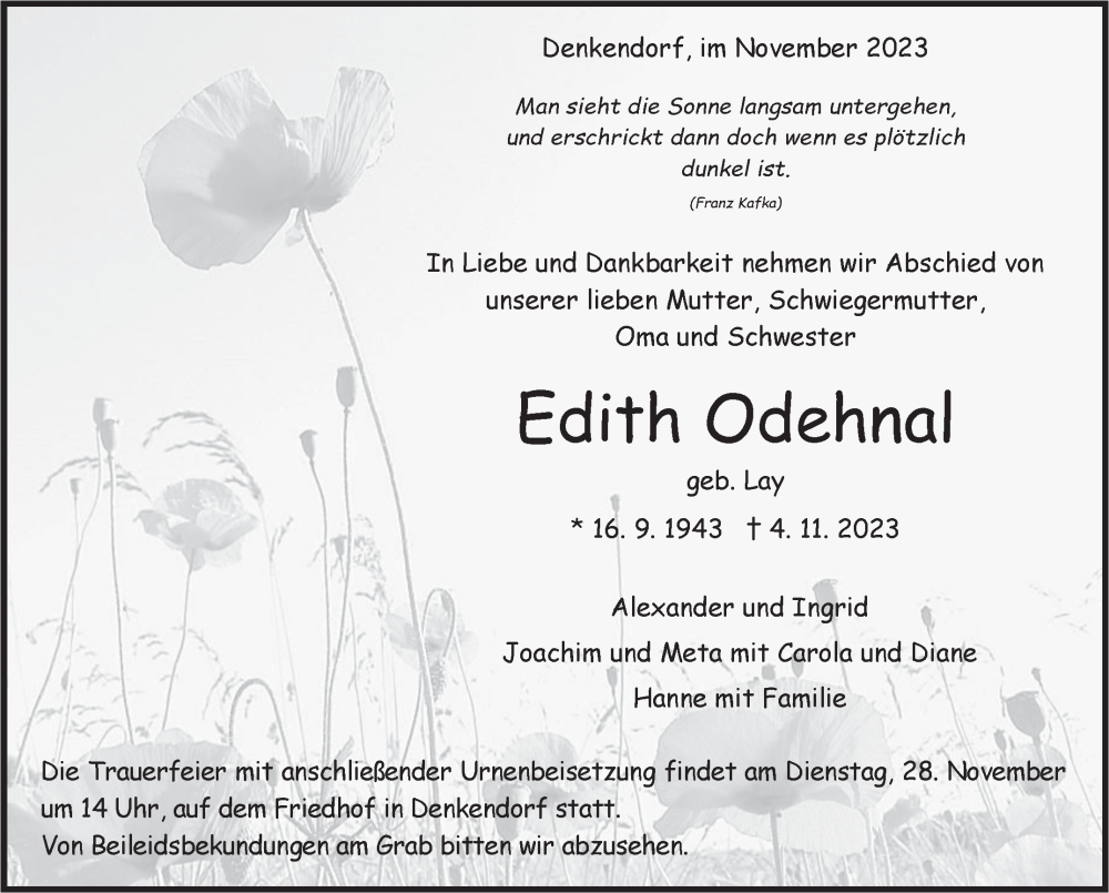 Hier finden Sie alle Traueranzeigen aus der Zeitung, die bisher für Edith Odehnal erschienen sind. Weitere Traueranzeigen, die in der Zeitung erscheinen, werden hier ebenfalls aufgelistet