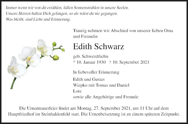 Hier finden Sie alle Traueranzeigen aus der Zeitung, die bisher für Edith Schwarz erschienen sind. Weitere Traueranzeigen, die in der Zeitung erscheinen, werden hier ebenfalls aufgelistet