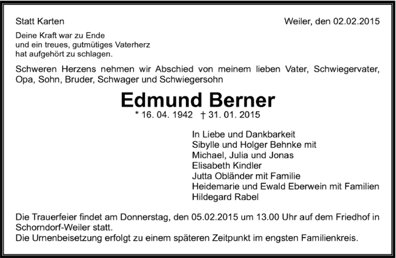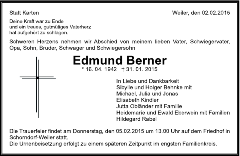 Hier finden Sie alle Traueranzeigen aus der Zeitung, die bisher für Edmund Berner erschienen sind. Weitere Traueranzeigen, die in der Zeitung erscheinen, werden hier ebenfalls aufgelistet