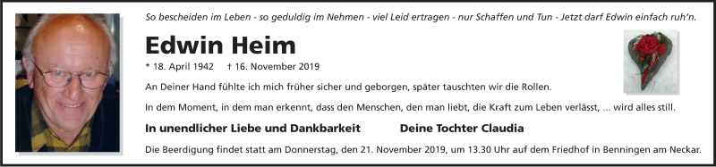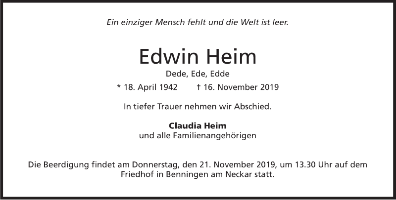 Hier finden Sie alle Traueranzeigen aus der Zeitung, die bisher für Edwin Heim erschienen sind. Weitere Traueranzeigen, die in der Zeitung erscheinen, werden hier ebenfalls aufgelistet
