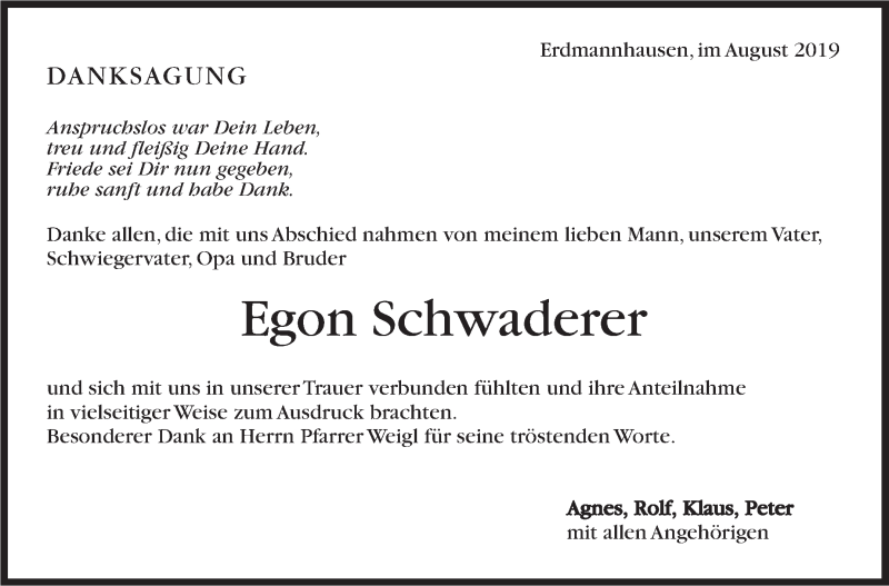 Hier finden Sie alle Traueranzeigen aus der Zeitung, die bisher für Egon Schwaderer erschienen sind. Weitere Traueranzeigen, die in der Zeitung erscheinen, werden hier ebenfalls aufgelistet