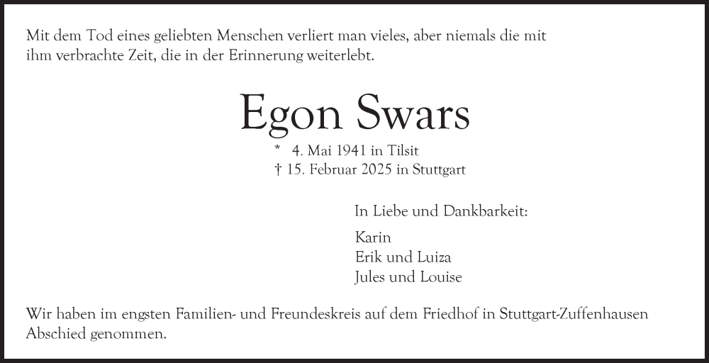 Hier finden Sie alle Traueranzeigen aus der Zeitung, die bisher für Egon Swars erschienen sind. Weitere Traueranzeigen, die in der Zeitung erscheinen, werden hier ebenfalls aufgelistet