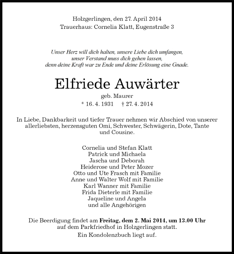 Hier finden Sie alle Traueranzeigen aus der Zeitung, die bisher für Elfriede Auwärter erschienen sind. Weitere Traueranzeigen, die in der Zeitung erscheinen, werden hier ebenfalls aufgelistet