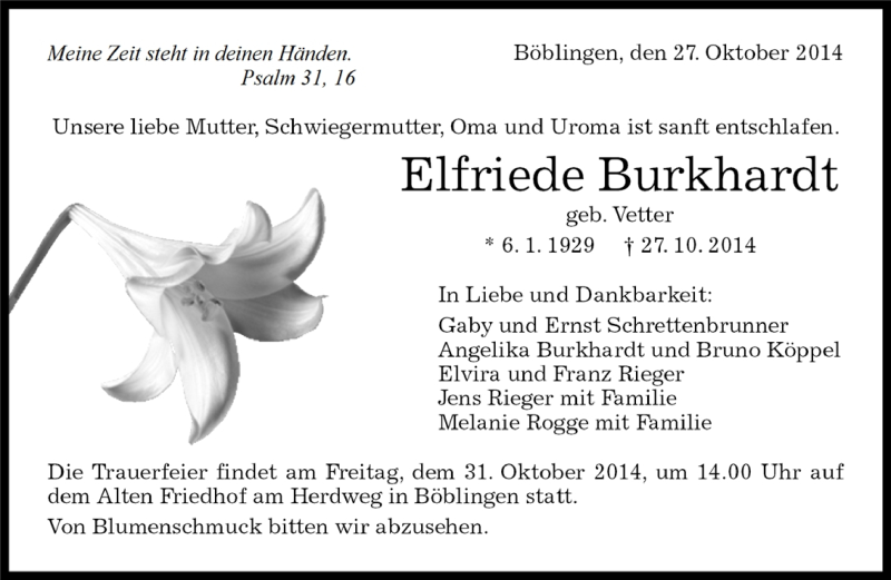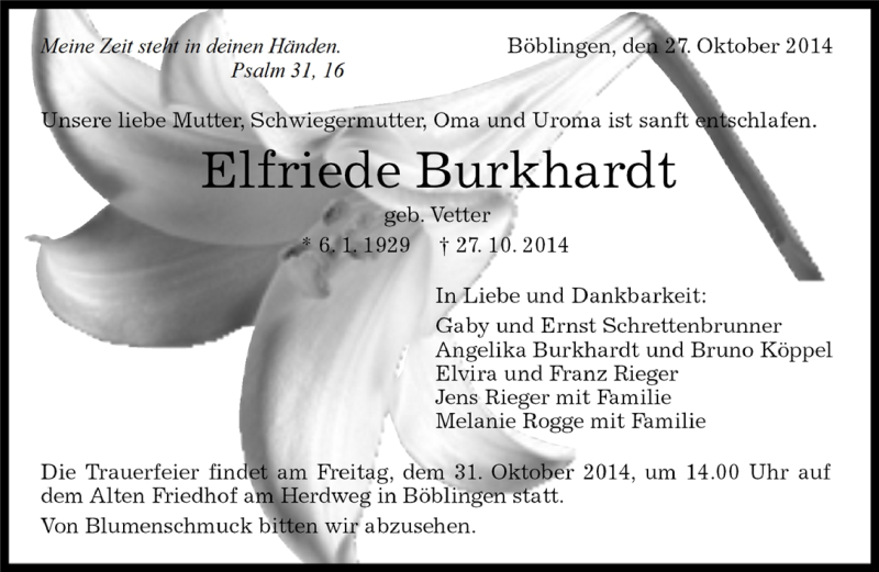 Hier finden Sie alle Traueranzeigen aus der Zeitung, die bisher für Elfriede Burkhardt erschienen sind. Weitere Traueranzeigen, die in der Zeitung erscheinen, werden hier ebenfalls aufgelistet