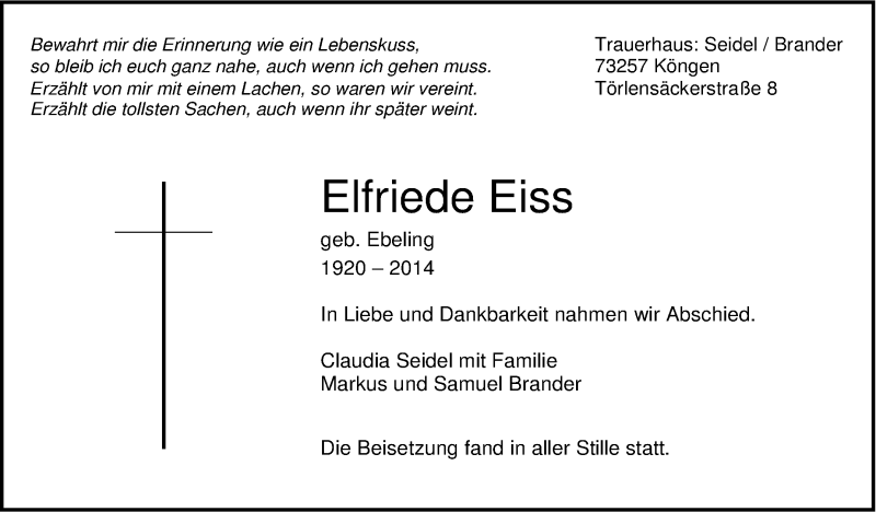 Hier finden Sie alle Traueranzeigen aus der Zeitung, die bisher für Elfriede Eiss erschienen sind. Weitere Traueranzeigen, die in der Zeitung erscheinen, werden hier ebenfalls aufgelistet