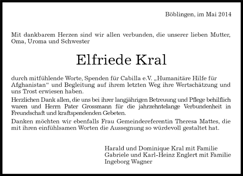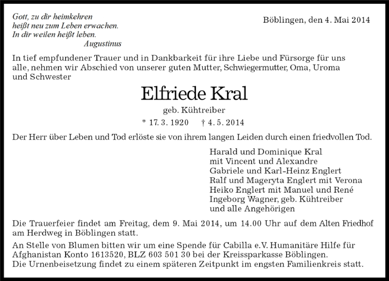Hier finden Sie alle Traueranzeigen aus der Zeitung, die bisher für Elfriede Kral erschienen sind. Weitere Traueranzeigen, die in der Zeitung erscheinen, werden hier ebenfalls aufgelistet