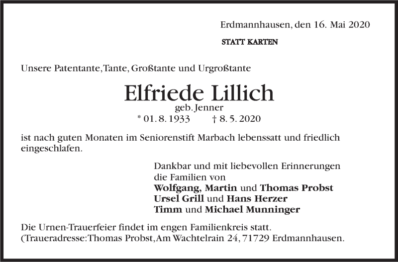 Hier finden Sie alle Traueranzeigen aus der Zeitung, die bisher für Elfriede Lillich erschienen sind. Weitere Traueranzeigen, die in der Zeitung erscheinen, werden hier ebenfalls aufgelistet