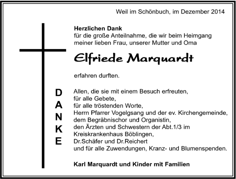 Hier finden Sie alle Traueranzeigen aus der Zeitung, die bisher für Elfriede Marquardt erschienen sind. Weitere Traueranzeigen, die in der Zeitung erscheinen, werden hier ebenfalls aufgelistet