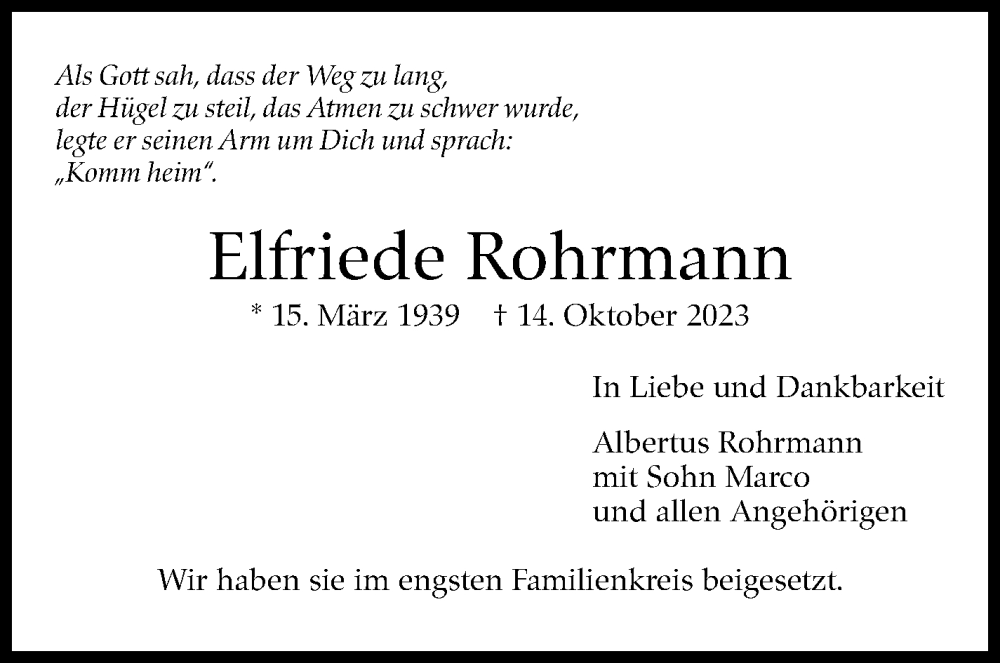 Hier finden Sie alle Traueranzeigen aus der Zeitung, die bisher für Elfriede Rohrmann erschienen sind. Weitere Traueranzeigen, die in der Zeitung erscheinen, werden hier ebenfalls aufgelistet