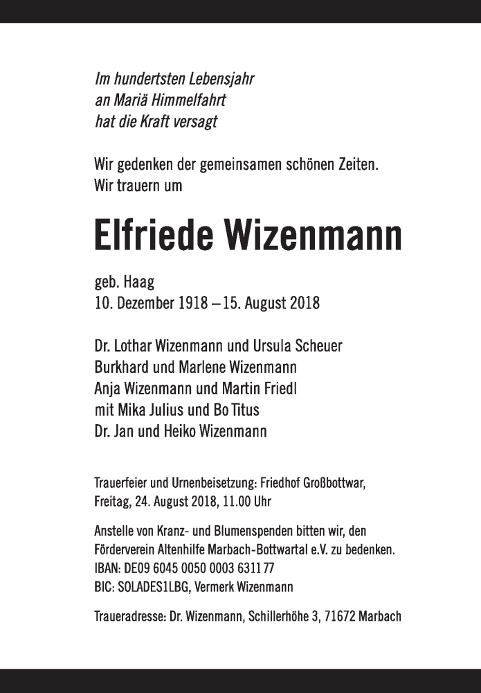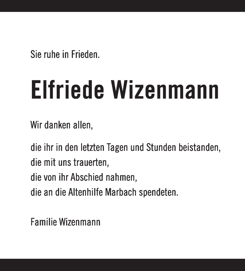 Hier finden Sie alle Traueranzeigen aus der Zeitung, die bisher für Elfriede Wizenmann erschienen sind. Weitere Traueranzeigen, die in der Zeitung erscheinen, werden hier ebenfalls aufgelistet