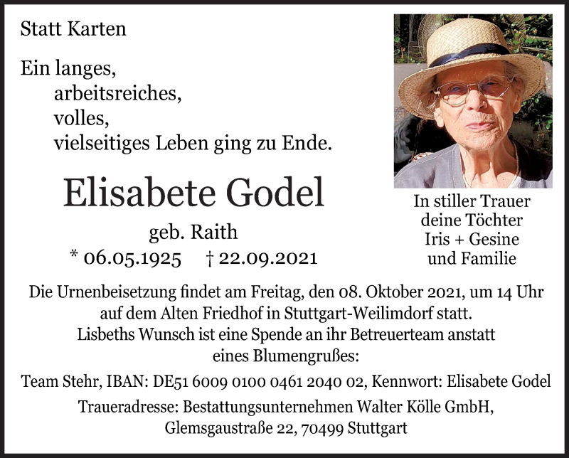 Hier finden Sie alle Traueranzeigen aus der Zeitung, die bisher für Elisabete Godel erschienen sind. Weitere Traueranzeigen, die in der Zeitung erscheinen, werden hier ebenfalls aufgelistet