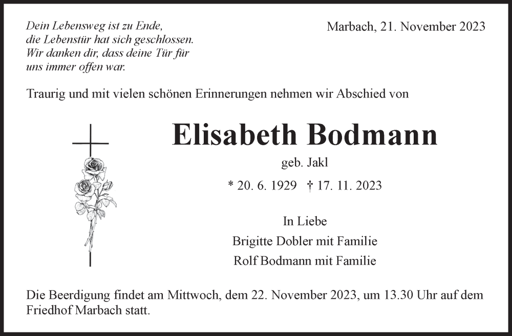 Hier finden Sie alle Traueranzeigen aus der Zeitung, die bisher für Elisabeth Bodmann erschienen sind. Weitere Traueranzeigen, die in der Zeitung erscheinen, werden hier ebenfalls aufgelistet