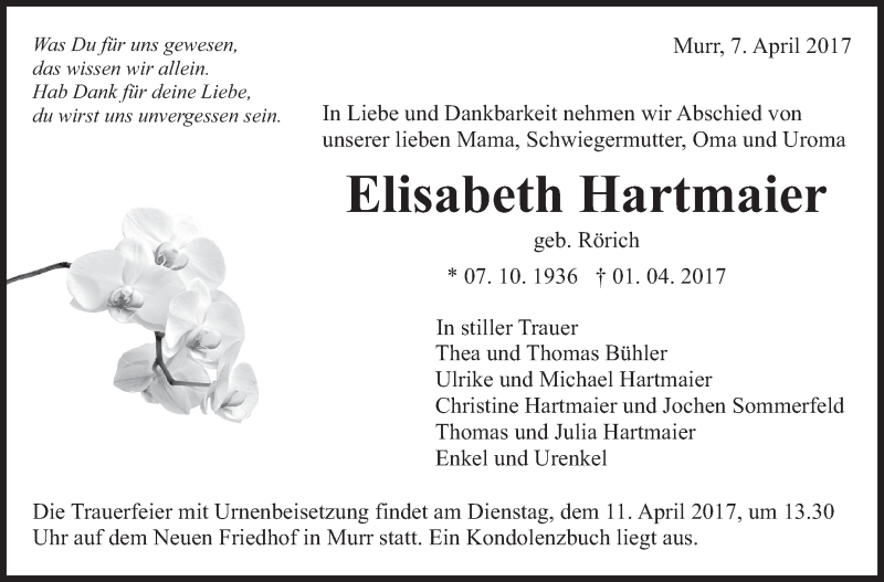 Hier finden Sie alle Traueranzeigen aus der Zeitung, die bisher für Elisabeth Hartmaier erschienen sind. Weitere Traueranzeigen, die in der Zeitung erscheinen, werden hier ebenfalls aufgelistet