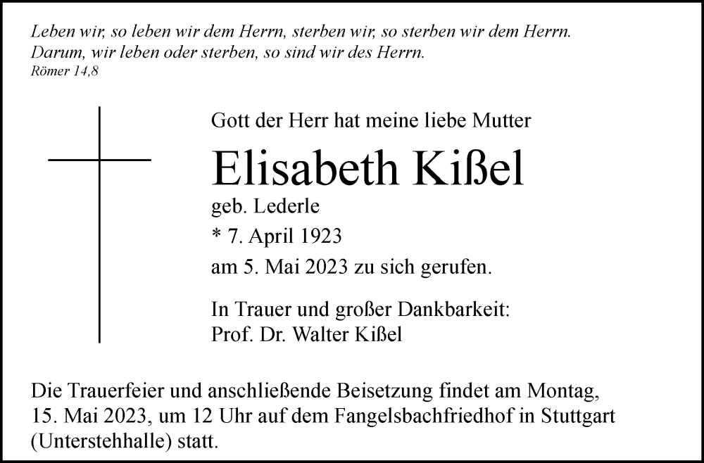 Hier finden Sie alle Traueranzeigen aus der Zeitung, die bisher für Elisabeth Kißel erschienen sind. Weitere Traueranzeigen, die in der Zeitung erscheinen, werden hier ebenfalls aufgelistet