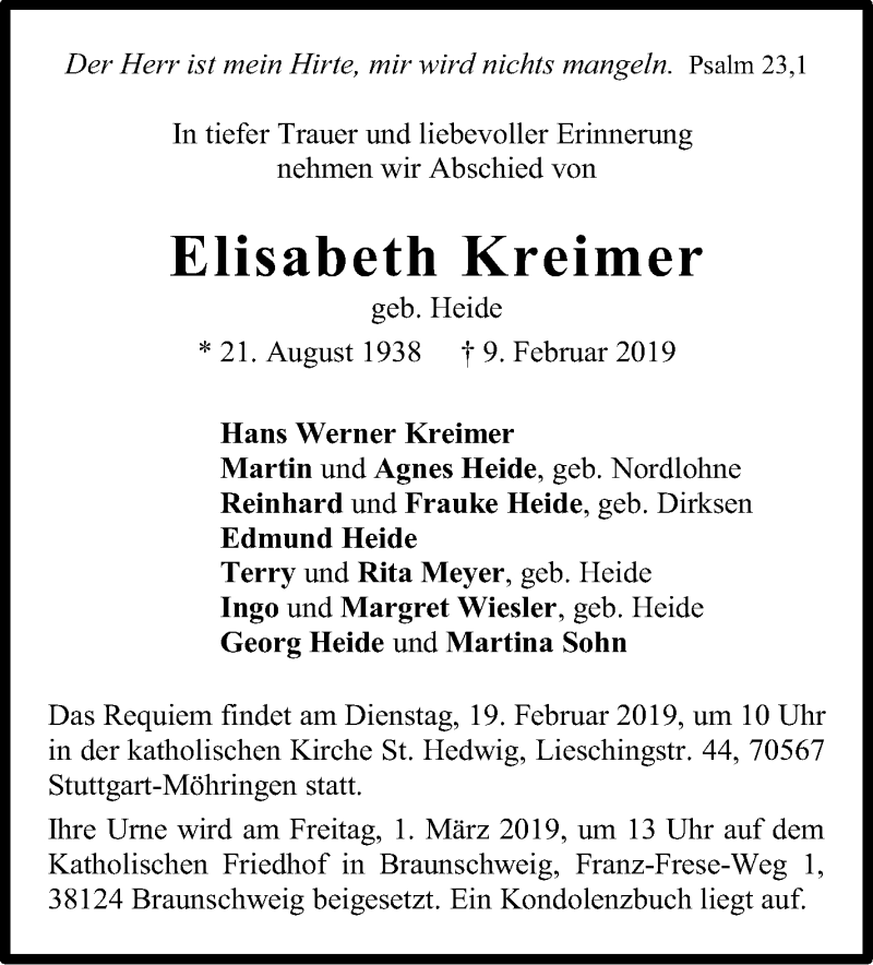 Hier finden Sie alle Traueranzeigen aus der Zeitung, die bisher für Elisabeth Kreimer erschienen sind. Weitere Traueranzeigen, die in der Zeitung erscheinen, werden hier ebenfalls aufgelistet
