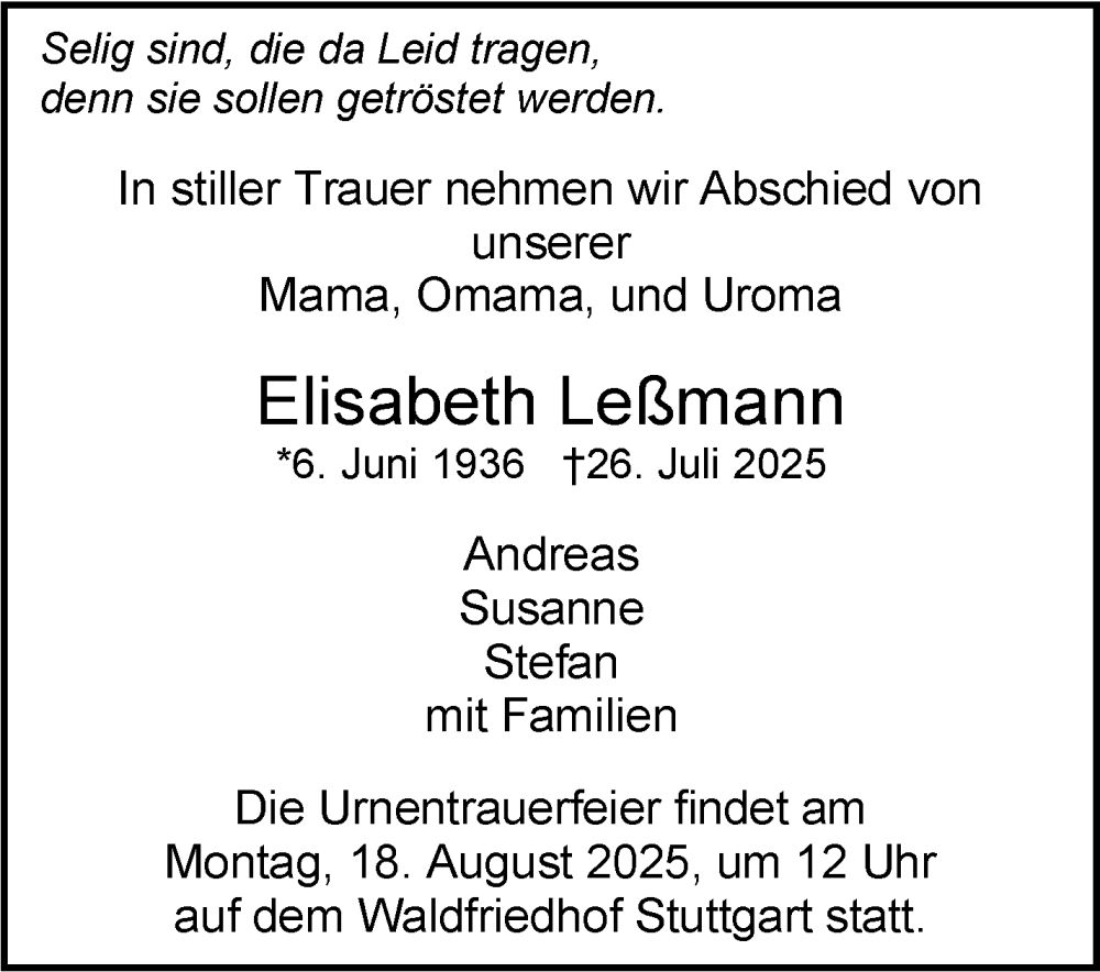 Hier finden Sie alle Traueranzeigen aus der Zeitung, die bisher für Elisabeth Leßmann erschienen sind. Weitere Traueranzeigen, die in der Zeitung erscheinen, werden hier ebenfalls aufgelistet
