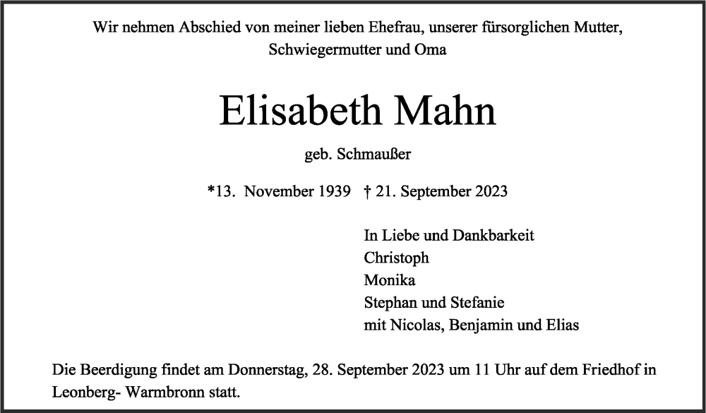 Hier finden Sie alle Traueranzeigen aus der Zeitung, die bisher für Elisabeth Mahn erschienen sind. Weitere Traueranzeigen, die in der Zeitung erscheinen, werden hier ebenfalls aufgelistet