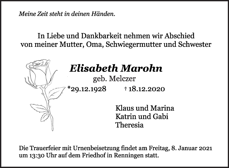 Hier finden Sie alle Traueranzeigen aus der Zeitung, die bisher für Elisabeth Marohn erschienen sind. Weitere Traueranzeigen, die in der Zeitung erscheinen, werden hier ebenfalls aufgelistet