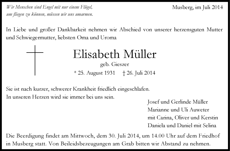 Hier finden Sie alle Traueranzeigen aus der Zeitung, die bisher für Elisabeth Müller erschienen sind. Weitere Traueranzeigen, die in der Zeitung erscheinen, werden hier ebenfalls aufgelistet