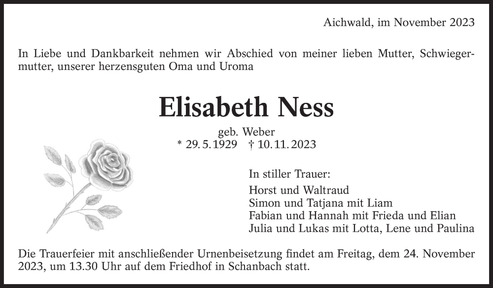 Hier finden Sie alle Traueranzeigen aus der Zeitung, die bisher für Elisabeth Ness erschienen sind. Weitere Traueranzeigen, die in der Zeitung erscheinen, werden hier ebenfalls aufgelistet