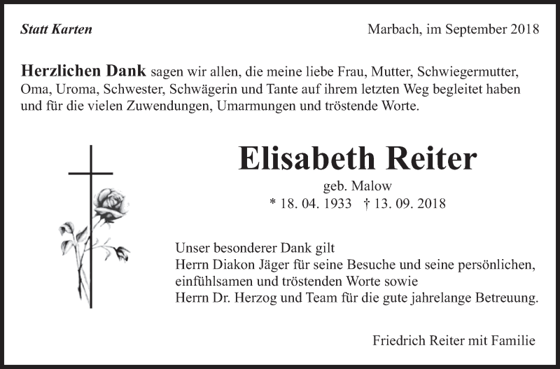 Hier finden Sie alle Traueranzeigen aus der Zeitung, die bisher für Elisabeth Reiter erschienen sind. Weitere Traueranzeigen, die in der Zeitung erscheinen, werden hier ebenfalls aufgelistet
