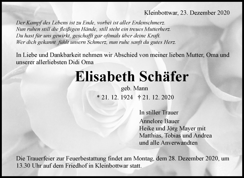 Hier finden Sie alle Traueranzeigen aus der Zeitung, die bisher für Elisabeth Schäfer erschienen sind. Weitere Traueranzeigen, die in der Zeitung erscheinen, werden hier ebenfalls aufgelistet