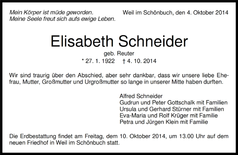 Hier finden Sie alle Traueranzeigen aus der Zeitung, die bisher für Elisabeth Schneider erschienen sind. Weitere Traueranzeigen, die in der Zeitung erscheinen, werden hier ebenfalls aufgelistet